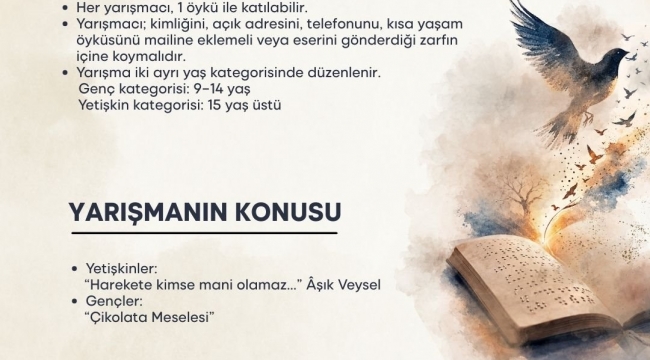 Yarışma için katılım koşulları da belirlendi. Buna göre her yarışmacı bir öykü ile katılabilecek. Yarışmacı; kimliğini, açık adresini, telefon numarasını, kısa yaşam öyküsünü e-mailine veya eserini gönderdiği zarfa ekleyecek. Yarışma, “Yetişkin” ve “Genç” olmak üzere iki ayrı kategoride düzenlenecek. “Genç” kategorisine 9-14 yaş, “Yetişkin” kategorisine ise 15 yaş üstü kişiler katılabiliyor. “Yetişkin” kategorisinin konusu “Harekete Kimse Mani Olamaz… Âşık Veysel”, “Genç” kategorisinin konusu ise “Çikolata Meselesi” olacak.