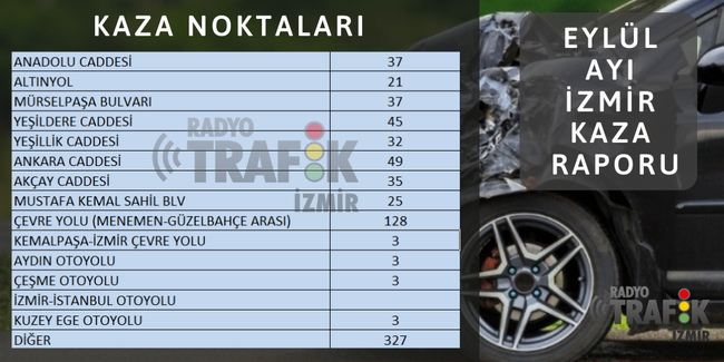 Radyo Trafik İzmir haber merkezine ulaşan bilgilere göre, İzmir’de ana yollarda Eylül ayı içerisinde 748 trafik kazası meydana geldi. Bu kazalardan 640’ı hasarlı, 95’i yaralanmalıydı. 13 kaza ise ölümlü olarak kayıtlara geçti.