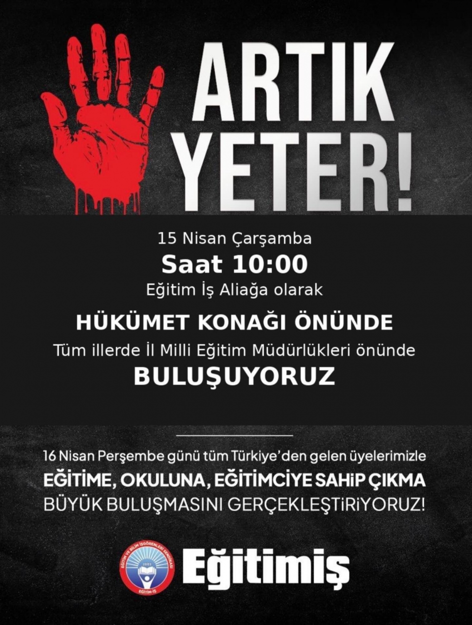"Eğitimin ve eğitim emekçisinin değersizleştirilmesine, gençlerimizin umutsuzluğa itilmesine ve can güvenliklerinin ortadan kalkmasına karşı 'Artık yeter' diyoruz. 15-16 Nisan 2026 tarihlerinde 2 gün süreyle iş bırakıyoruz."