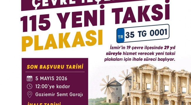 İzmir Büyükşehir Belediyesi, Aliağa, Bayındır, Bergama, Beydağ, Çeşme, Dikili, Foça, Karaburun, Kemalpaşa, Kınık, Kiraz, Menderes, Menemen, Ödemiş, Seferihisar, Selçuk, Tire, Torbalı, Urla olmak üzere 19 çevre ilçede 29 yıl süreyle hizmet verecek yeni taksi plakaları için ihale sürecini başlattı. İzmir Büyükşehir Belediye Meclisi tarafından geçtiğimiz ay onaylanan çalışma kapsamında ihale, 7 Mayıs 2026 Perşembe günü saat 14.00’te belediye Meclis Salonu’nda gerçekleştirilecek.